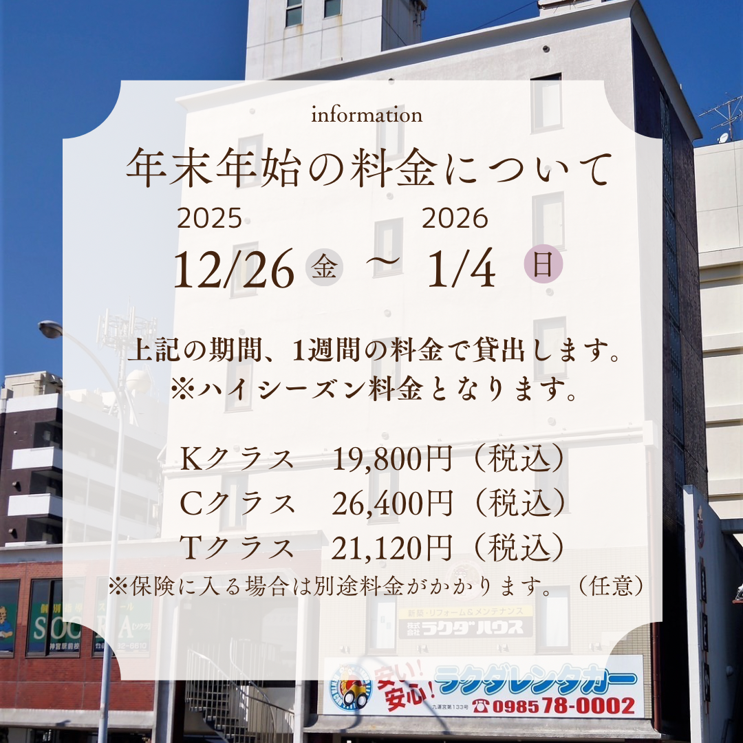上記の期間(9日間)、1週間のハイシーズン料金でレンタカーの貸し出しを行います。